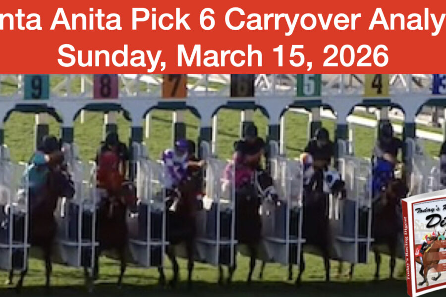 Santa Anita ParkVideos Video: Santa Anita Pick 6 Carryover (3-15-26) In this horse racing video recorded on 3-14-26, I analyze the Pick 6 at Santa…Jarrod HorakMarch 15, 2026